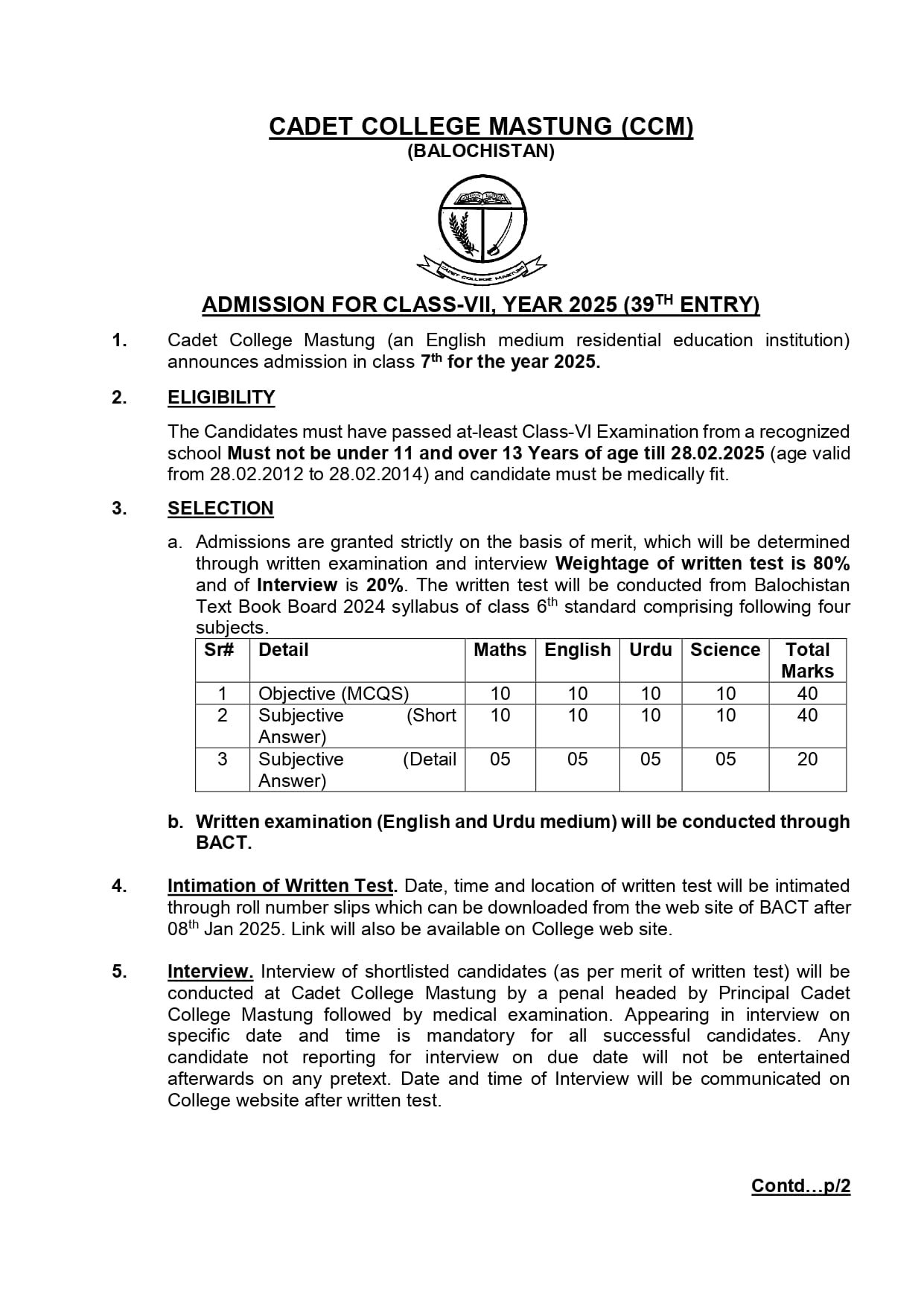 To submit your application, visit the official admission page for Cadet College Mastung at the following link: Cadet College Mastung Admission 2025. Ensure that you meet all requirements and submit your application before the deadline.