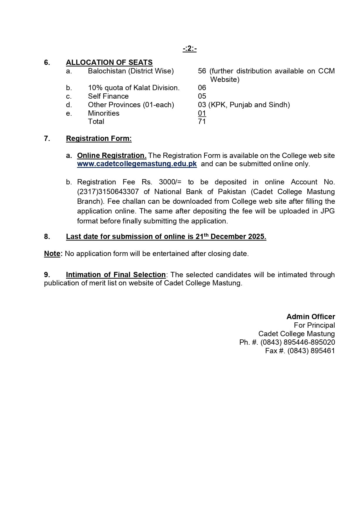 - Postal Address: Cadet College Mastung, Main RCD Road Mastung